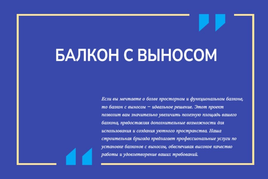 Если вы мечтаете о более просторном и функциональном балконе, то балкон с выносом – идеальное решение. Этот проект позволит вам значительно увеличить полезную площадь вашего балкона, предоставляя дополнительные возможности для использования и создания уютного пространства. Наша строительная бригада предлагает профессиональные услуги по установке балконов с выносом, обеспечивая высокое качество работы и удовлетворение ваших требований.
